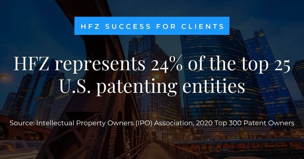 The Intellectual Property Owners Association (IPO) published its report on the top 300 patent owners in the world based on activity completed in 2020. HFZ represents 24% of the top 25 U.S. patenting entities. Congratulations to HFZ’s clients for their outstanding showing in leading the world in innovation.